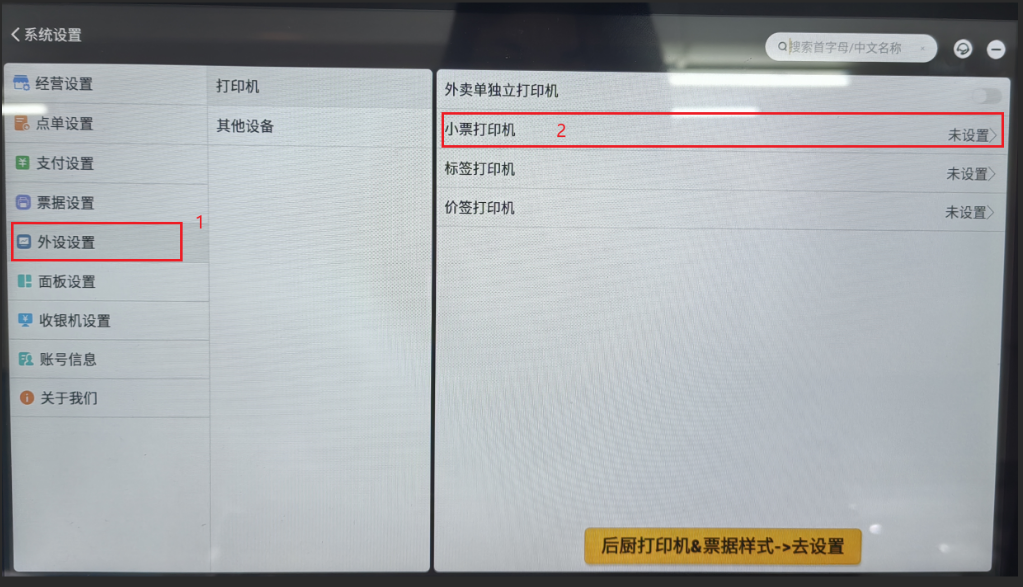 II.进入“系统设置”页面,点击侧边栏的“外设设置”,进入“外设设置”页面,点击“小票打印机”进行设置。