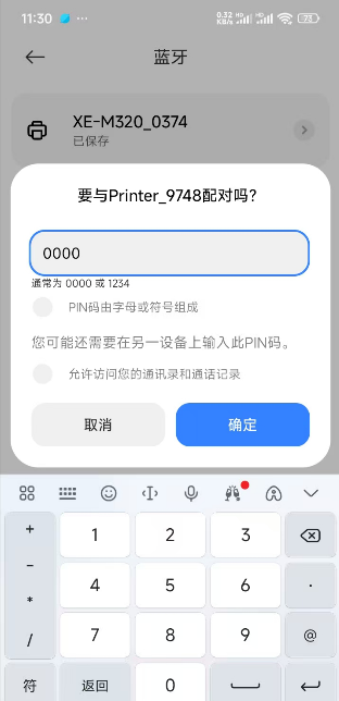 I.在手机“蓝牙设置”中,选择与打印机一致的蓝牙名称,输入配对码进行配对。(iOS端忽略此步骤,直接在软件上搜索蓝牙)
