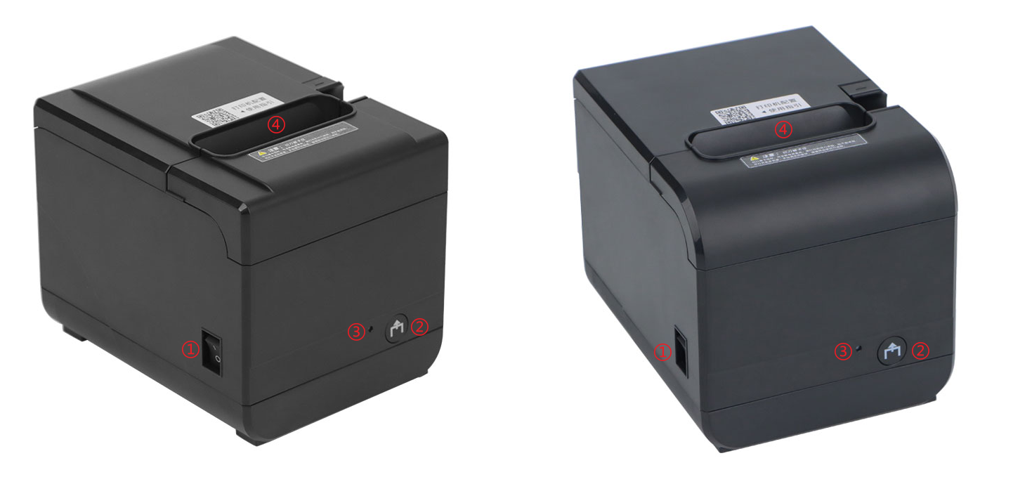 3)指示灯:蓝色,启动后常亮,开机由红灯变为蓝灯,开盖/缺纸时红灯常亮;