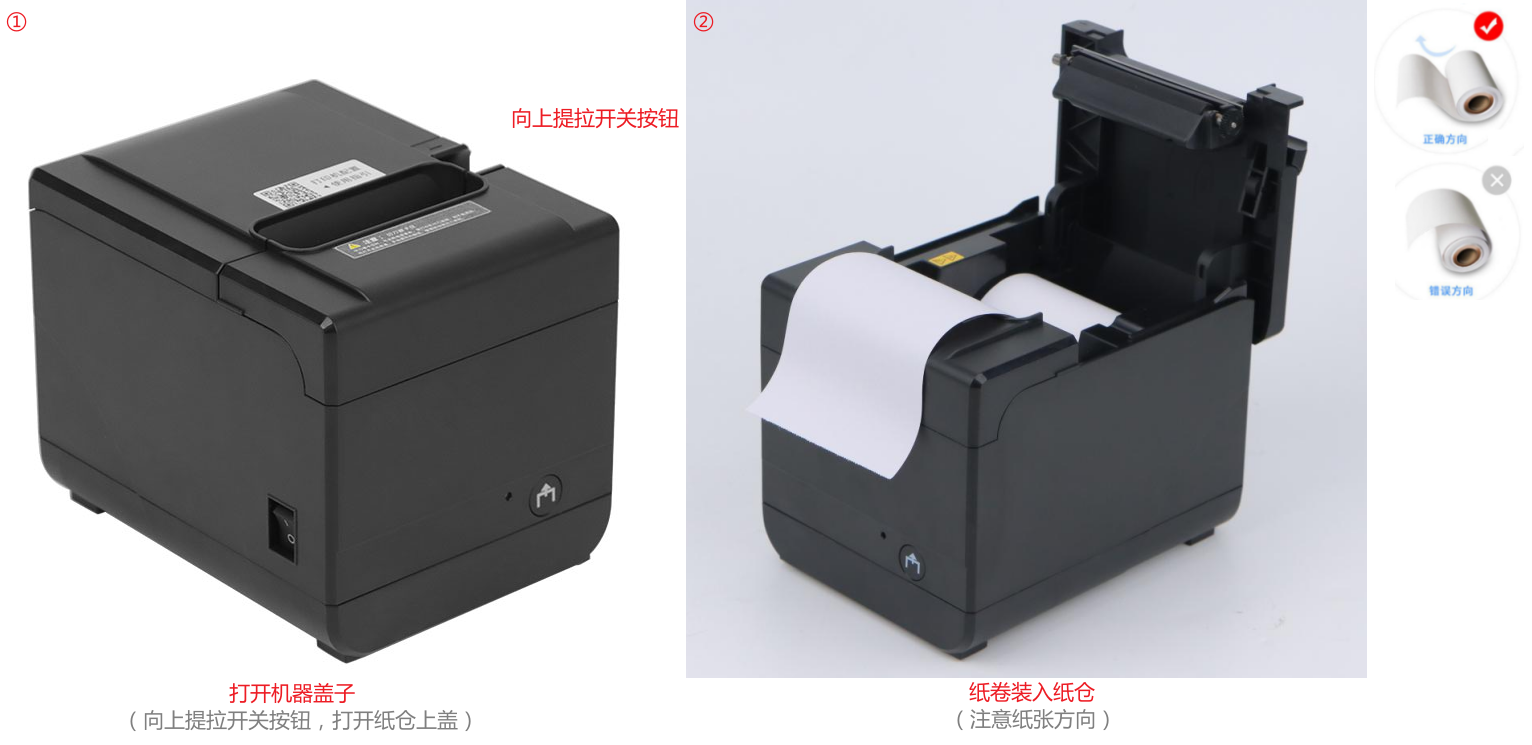 2) 按照图标方向安装纸卷,注意纸的方向;
