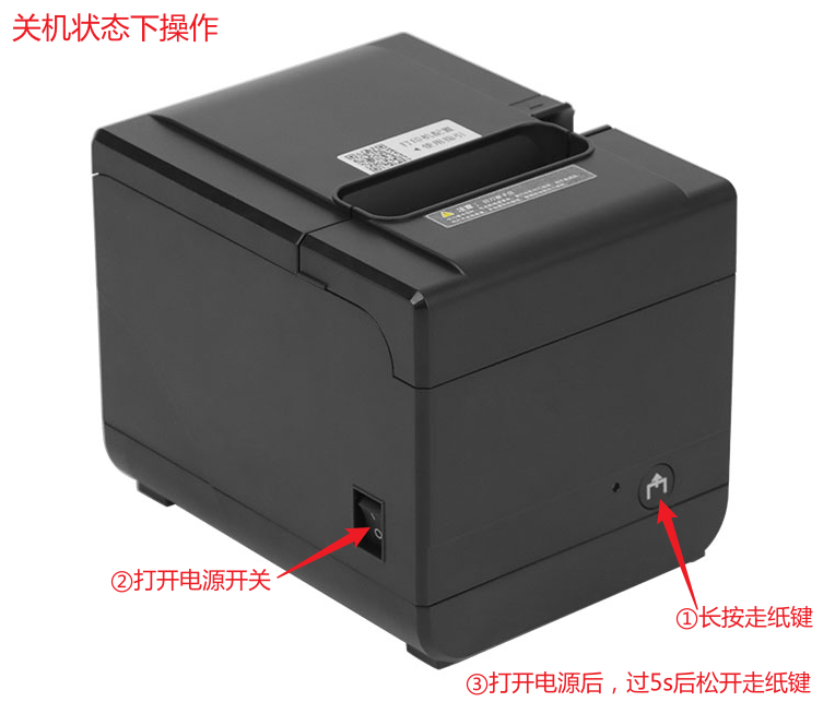 3)按住走纸键不松开,并打开打印机电源,5s后,松开走纸键,此时打印机会打印出自检测试页。